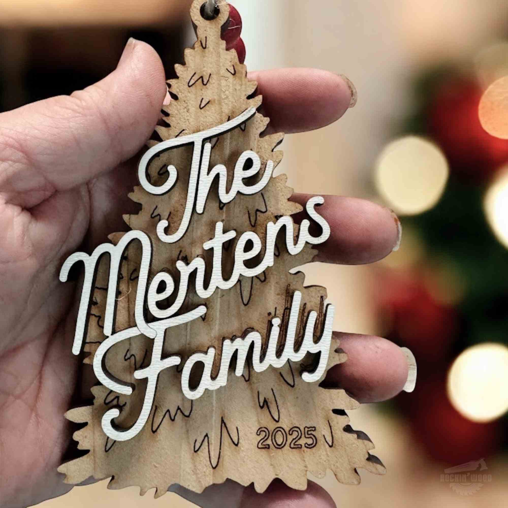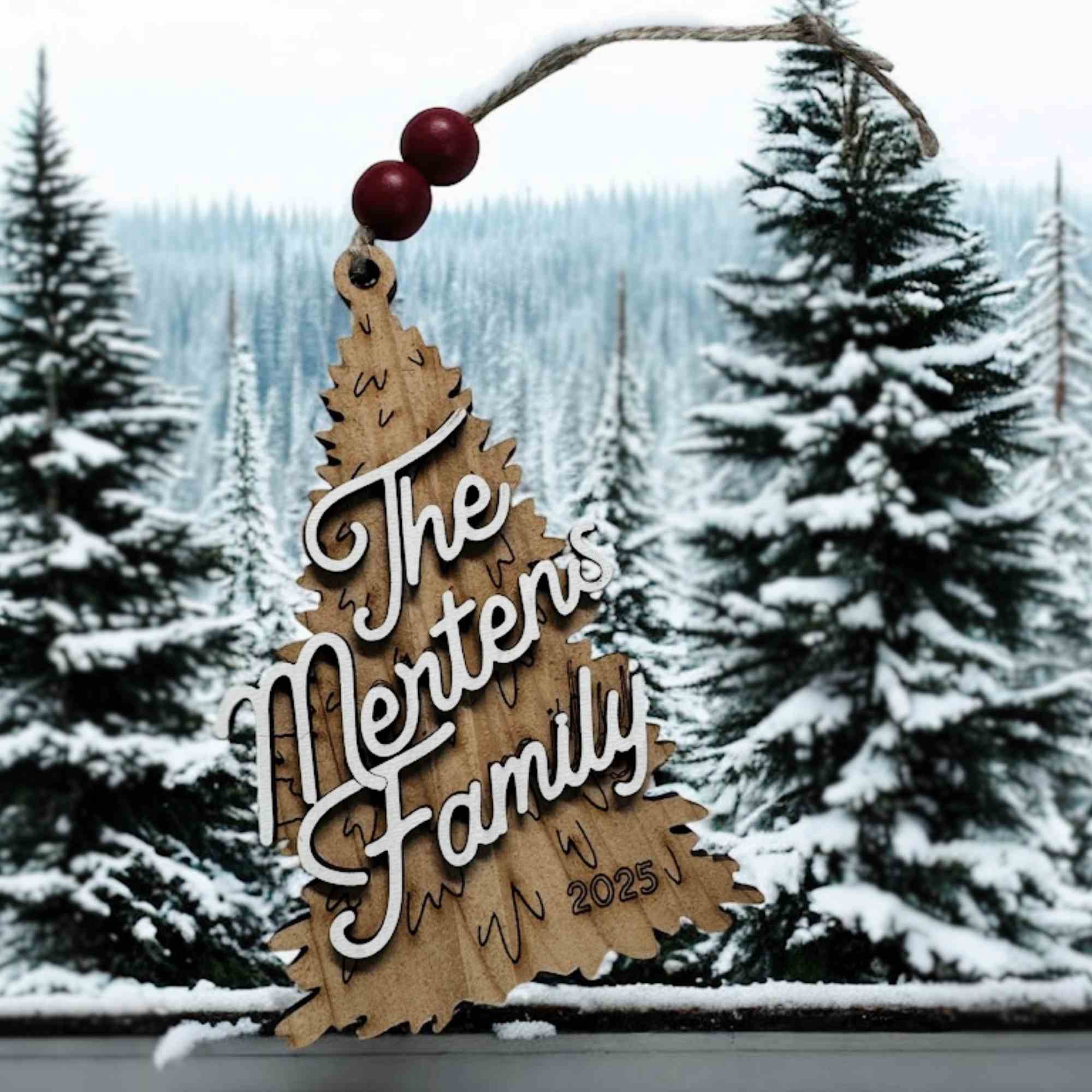 Add customization. Personalize it with your family name and the year 2025. This unique keepsake features a family name engraved on reclaimed wood. The top layer showcases the family name, making it a special addition to your Christmas tree.